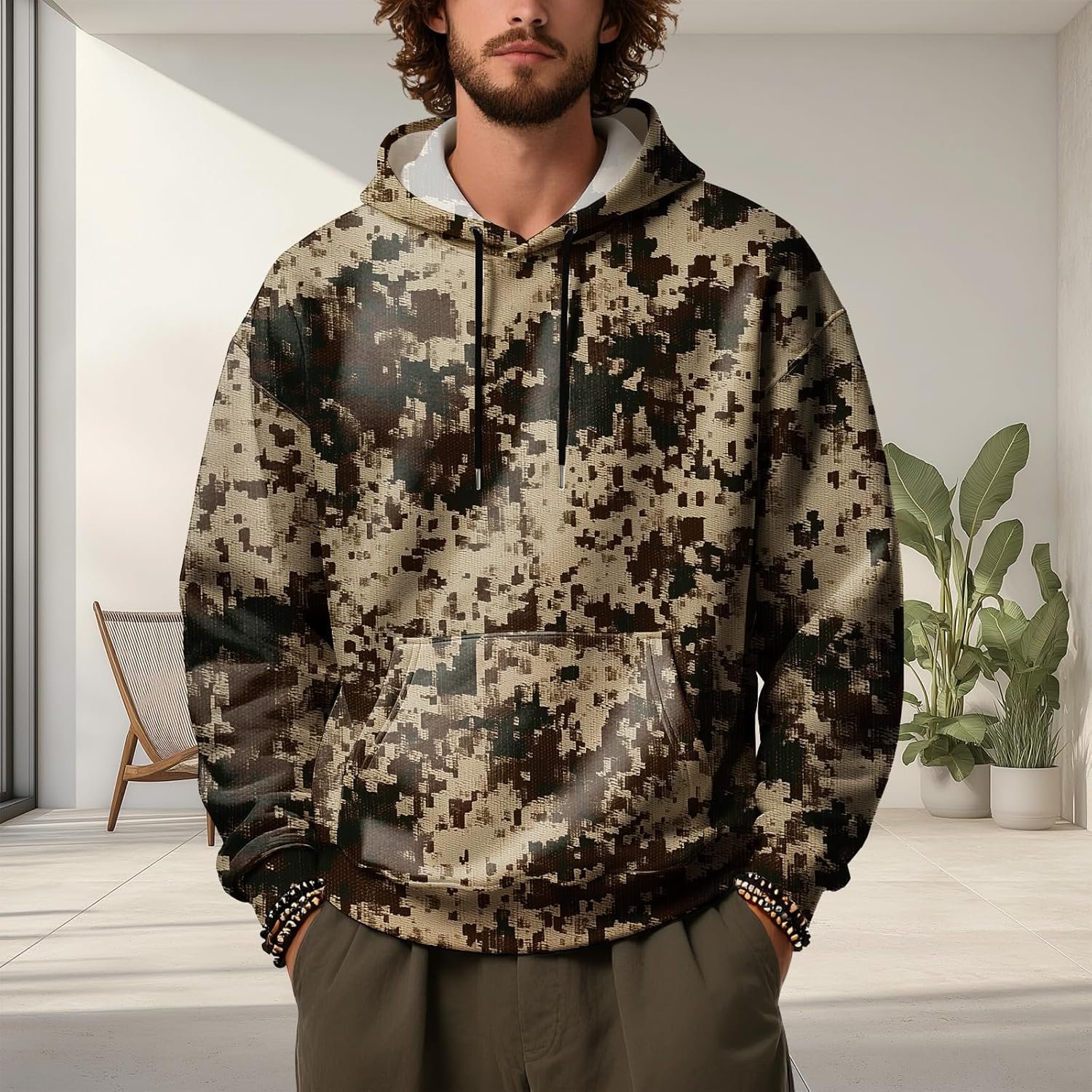 • Design: Features assorted camo prints—from classic woodland to subtle desert tones—for a tactical yet casual edge. Comes with a hood and adjustable drawcord for a snug, customizable fit; the roomy front kangaroo pocket works great for stashing essentials or warming hands on cool days. Ribbed cuffs and hem keep the fit neat, locking in warmth while complementing the rugged camo aesthetic.