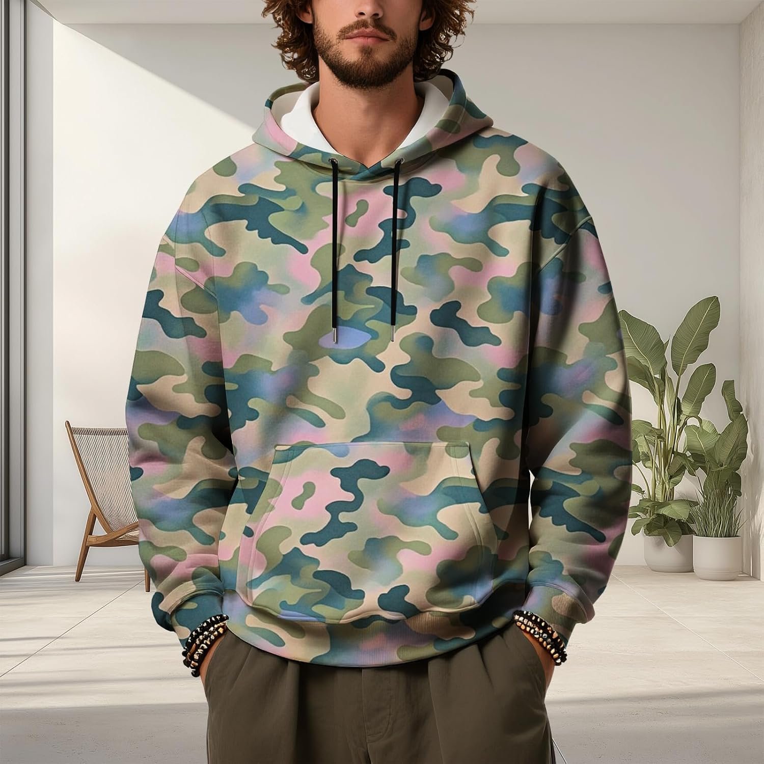 Camo Hoodies for Men Fall Casual Long Sleeve Drawstring Sweatshirts Baggy Workout Pullover Hoodies with Pockets