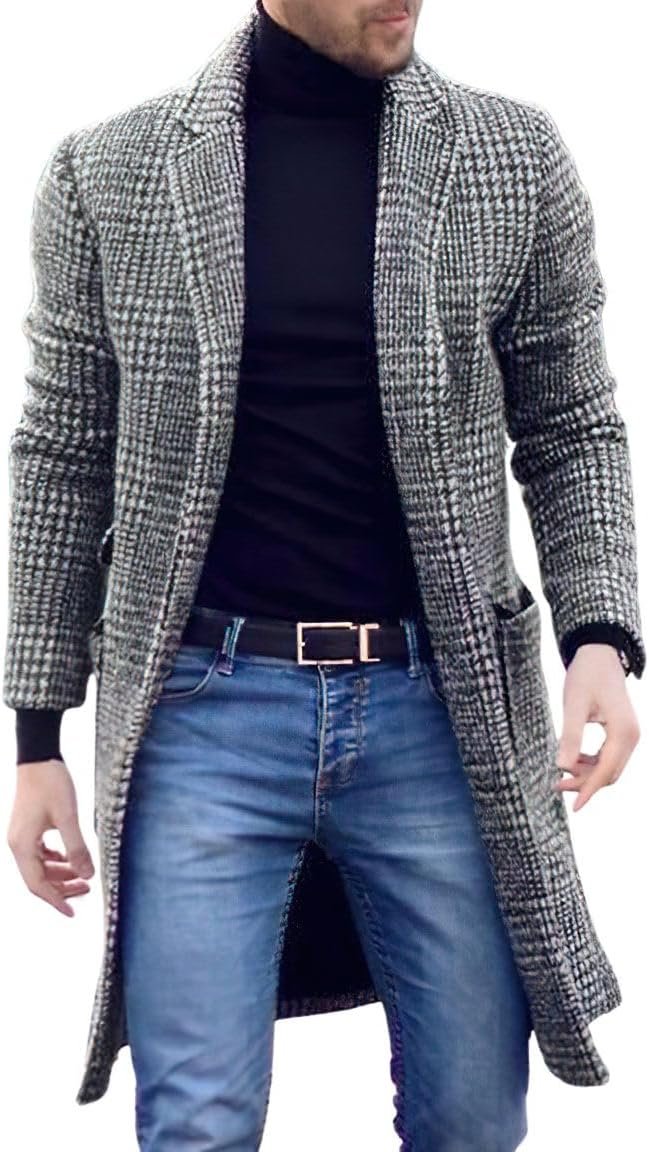 Men’s Casual Lapel Collar Wool Trench Coat Plaid Single Breasted Wool Blend Pea Coat with Pockets